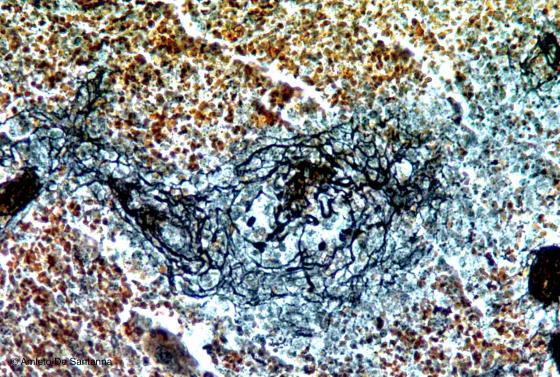 Figure C18. Mouse spleen. Thick network of reticular fibers that enclose a capillary. Bielschowsky X100