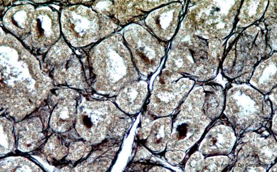 It seems like their major affinity for silver staining techniques, which is the base for Bielschowsky’s method for reticular fibers, is to be connected to fiber conformation and their surrounding matrix, rather than to the biochemical characteristics of fiber constituents. From a histological point of view, the only real difference between these and other collagen fibers is their organization: the latter are organized in bundles, while reticular fibers are isolated and generally form a thin meshwork. These fibers surround the single muscle fibers and the peripheral nerve fibers, in order to isolate them from each other. They associate to the basal lamina, underneath epithelia, surround the adipocytes and compose the thin meshwork that constitutes the connective stroma of lymphatic organs and large glands, both exocrine and endocrine.