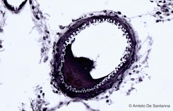 Figure C26. Human artery. Selective staining that highlight the elastic fibers of the tunica media (stained black). You can easily see the internal elastic membrane. In order to have a better contrast, the sample was stained also with H&E. Weigert/H&E X100