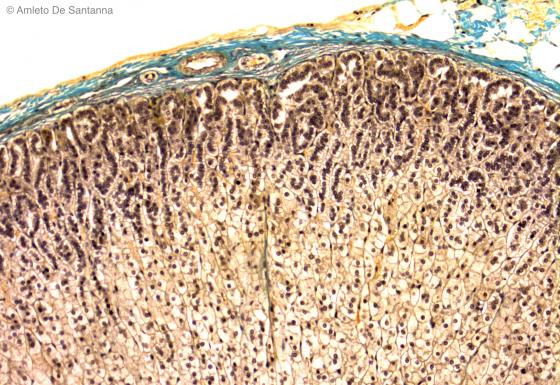 Figure C34. Rabbit surrenal gland. A capsular dense connective tissue, stained light blue-green, encloses the surrenal gland. Ignesti X100