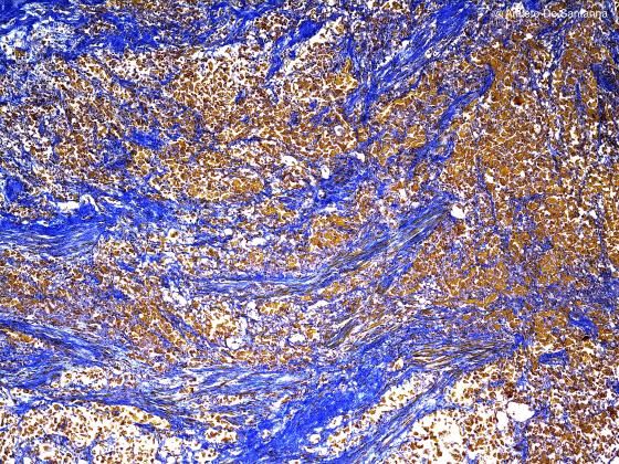 Figure C38. Human prostate gland. Dense connective tissue made up of interwoven fibers, stained light blue, and interspersed smooth muscle fibers, stained brown. Ignesti X40