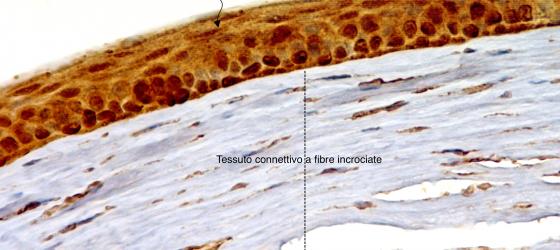 Figura C43. Occhio di topo. Cornea. Tessuto connettivo denso regolare a fasci incrociati (linea tratteggiata). In questo tipo di connettivo ogni strato di fibre è posto a 90° rispetto a quello successivo. Grazie a questa disposizione le fibre collagene danno una particolare trasparenza al tessuto permettendo il passaggio della luce senza aberrazioni. HRP Em 200x